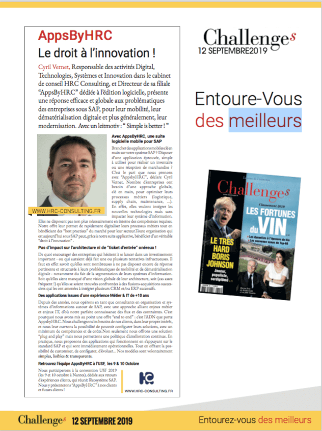Cyril Vernet, Responsable des activités Digital, Technologies, Systèmes et Innovation dans le cabinet de conseil HRC Consulting, et Directeur de sa filiale “AppsByHRC” – devenue HRC Software – dédiée à l’édition logicielle, présente une réponse efficace et globale aux problématiques des entreprises sous SAP, pour leur mobilité, leur dématérialisation digitale et plus généralement, leur modernisation. Avec un leitmotiv : “ Simple is better ! ”