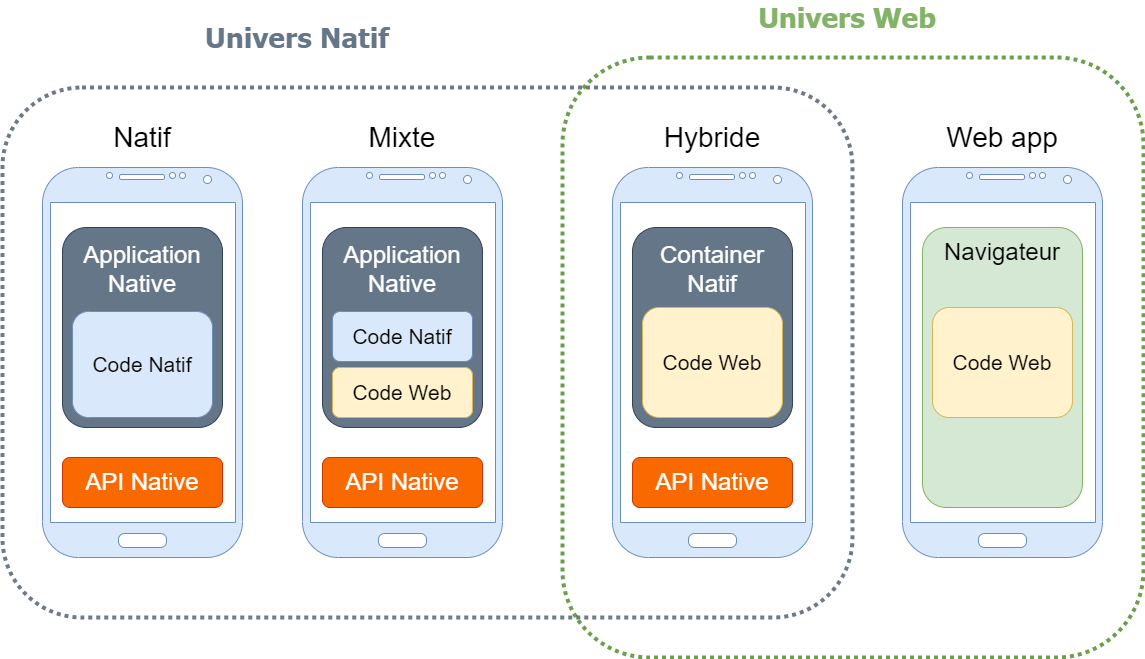 - Mixte (=native + hybride) : au sein d’une application native, on intègre une partie hybride (par exemple pour réutiliser un existant pour lequel un portage natif ne se justifie pas)